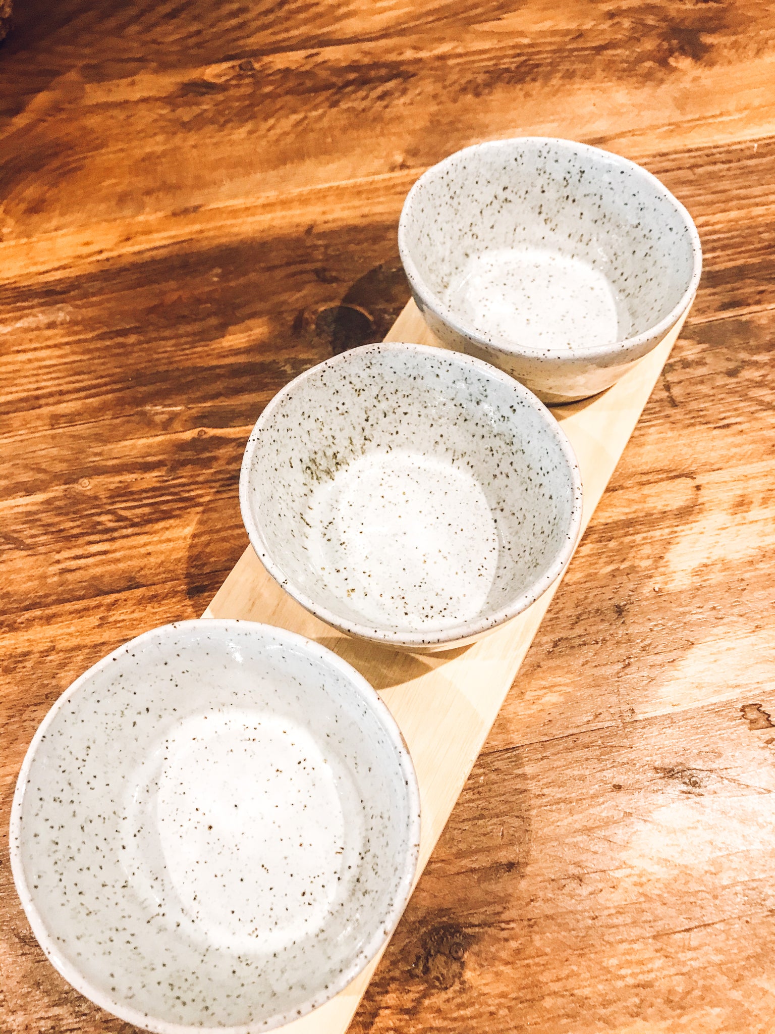 Artisan porcelain, wooden base and three bowls come as a set, made in earthy grey tones. Beautifully finished over a light grey base with speckled details, the reactive gloss glaze ensure every piece is unique.